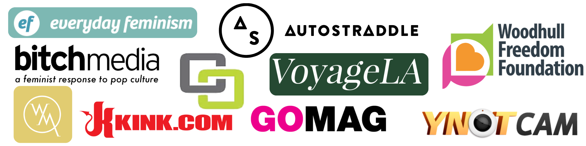 Go Mag, Autostraddle, Contemporary Relationships Conference, Woodhull Sexual Freedom Summit, Kink.com's Educational Series, Catalyst Con, OC CAMFT, Bitch Magazine, Self Magazine's Podcast Checking In, Trust & Thrive with Tara Mont, TASHRA, Everyday Feminism, The Knot Magazine, Voyage LA